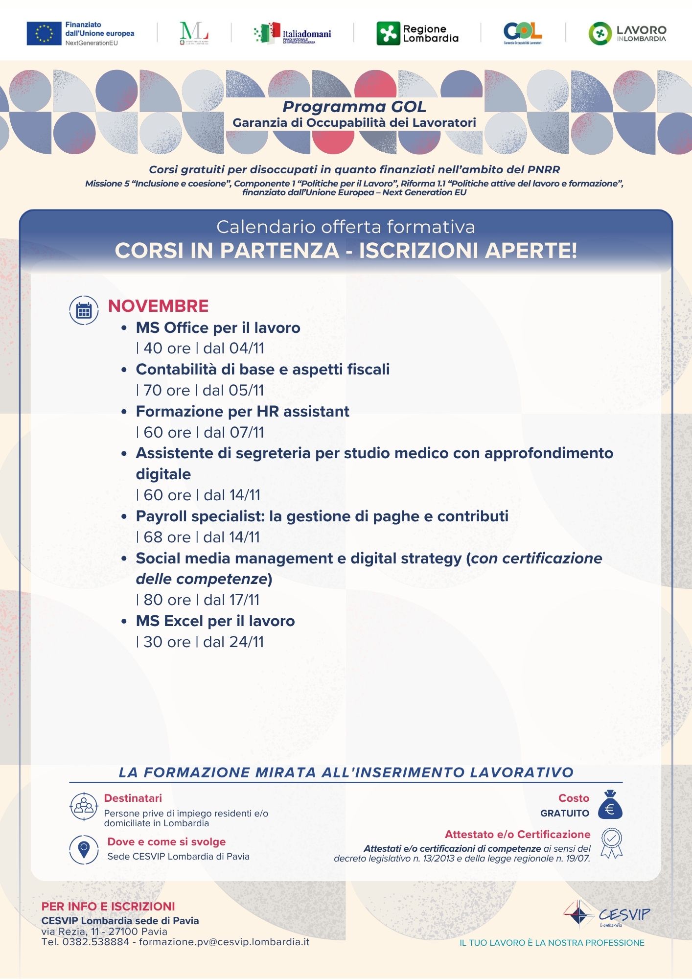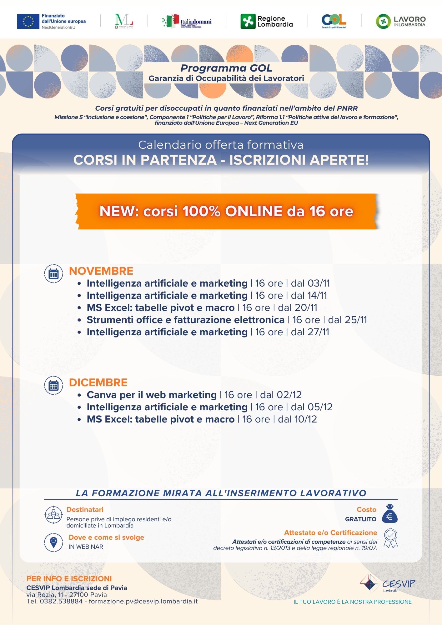 - corsi in presenza e/o modalità mista: novembre