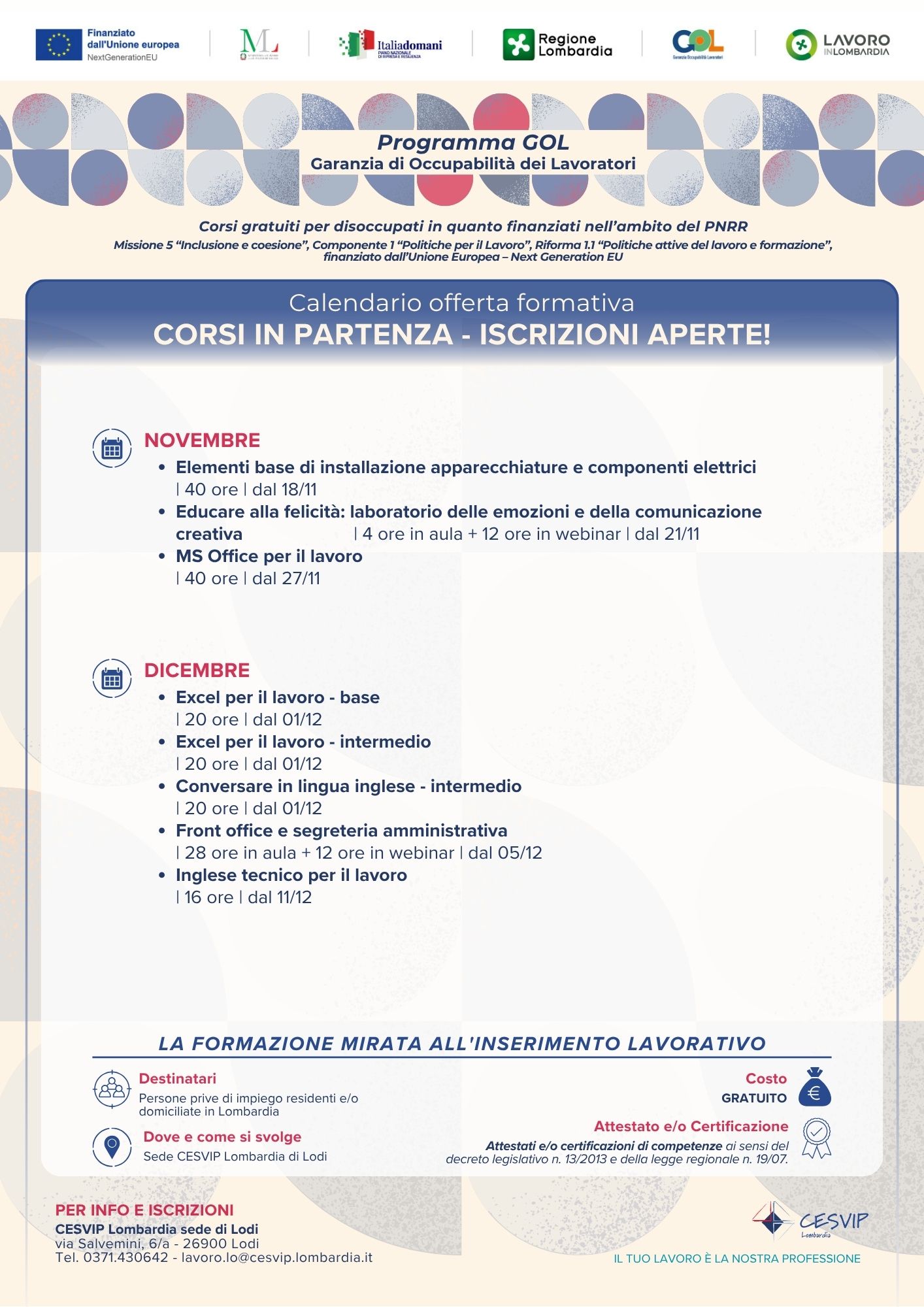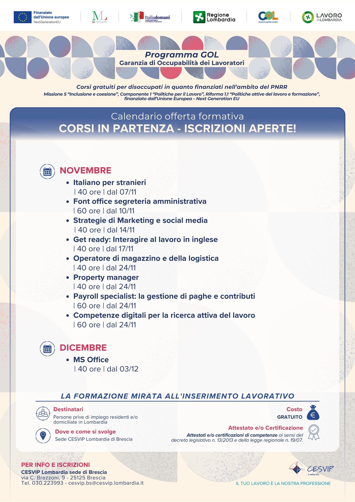 - corsi in presenza e/o modalità mista: novembre-dicembre