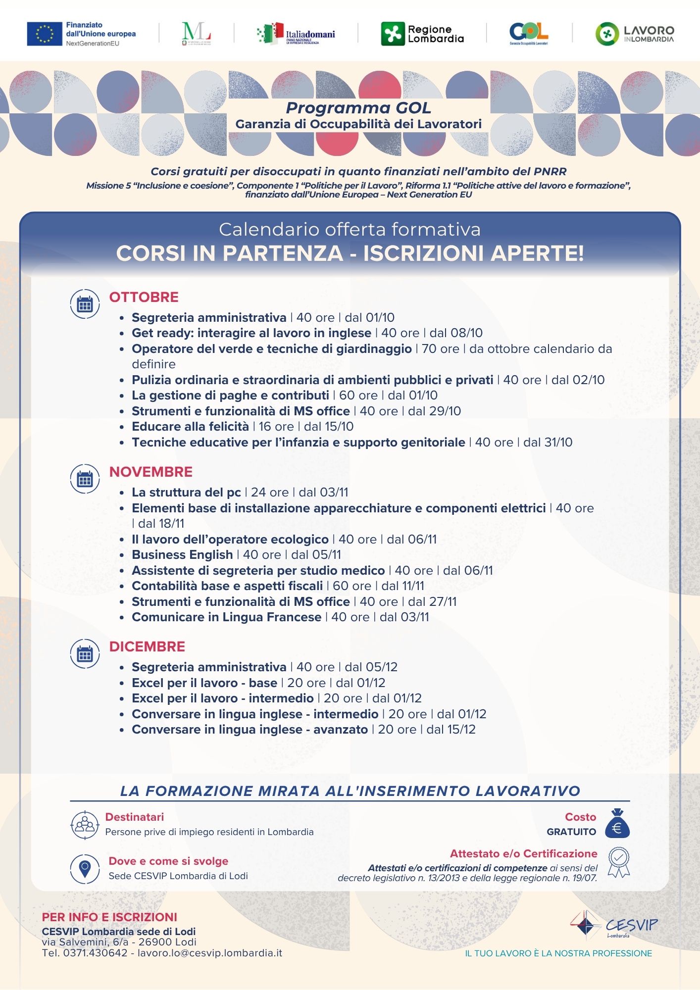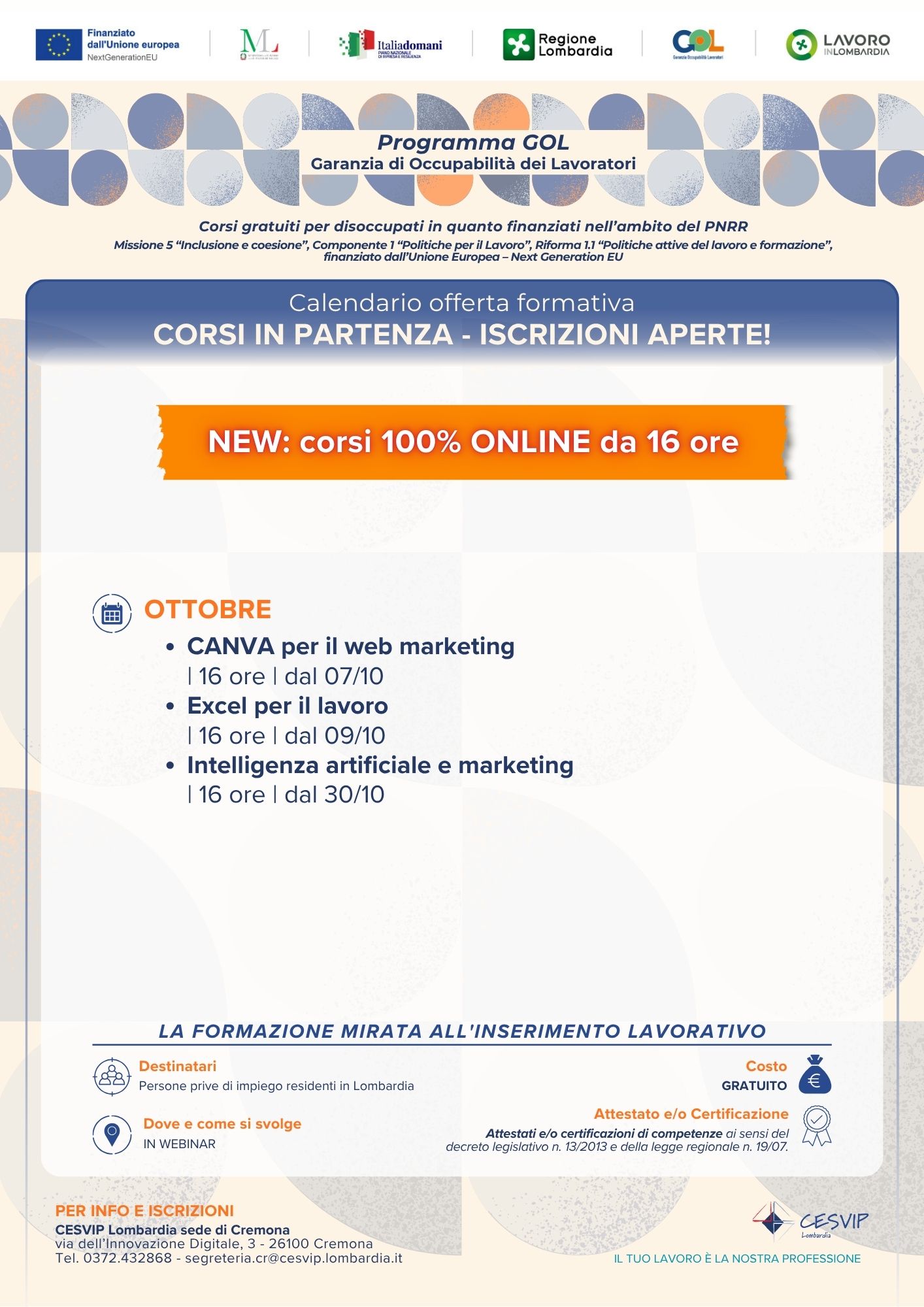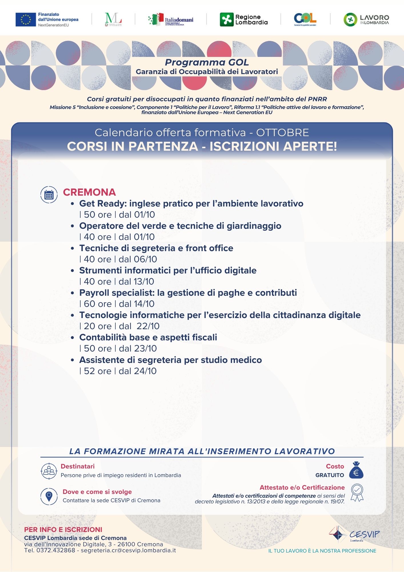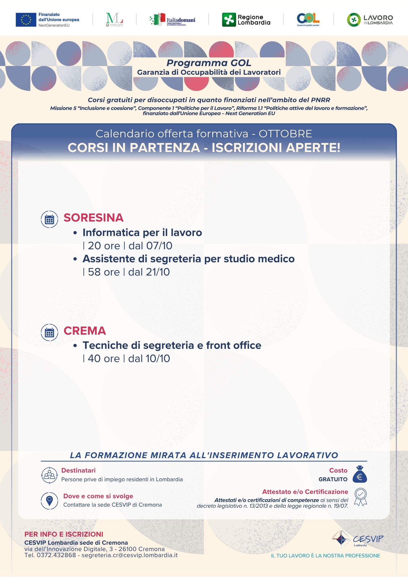 - corsi in presenza e/o modalità mista: ottobre (Cremona) | ottobre (Crema e Soresina)