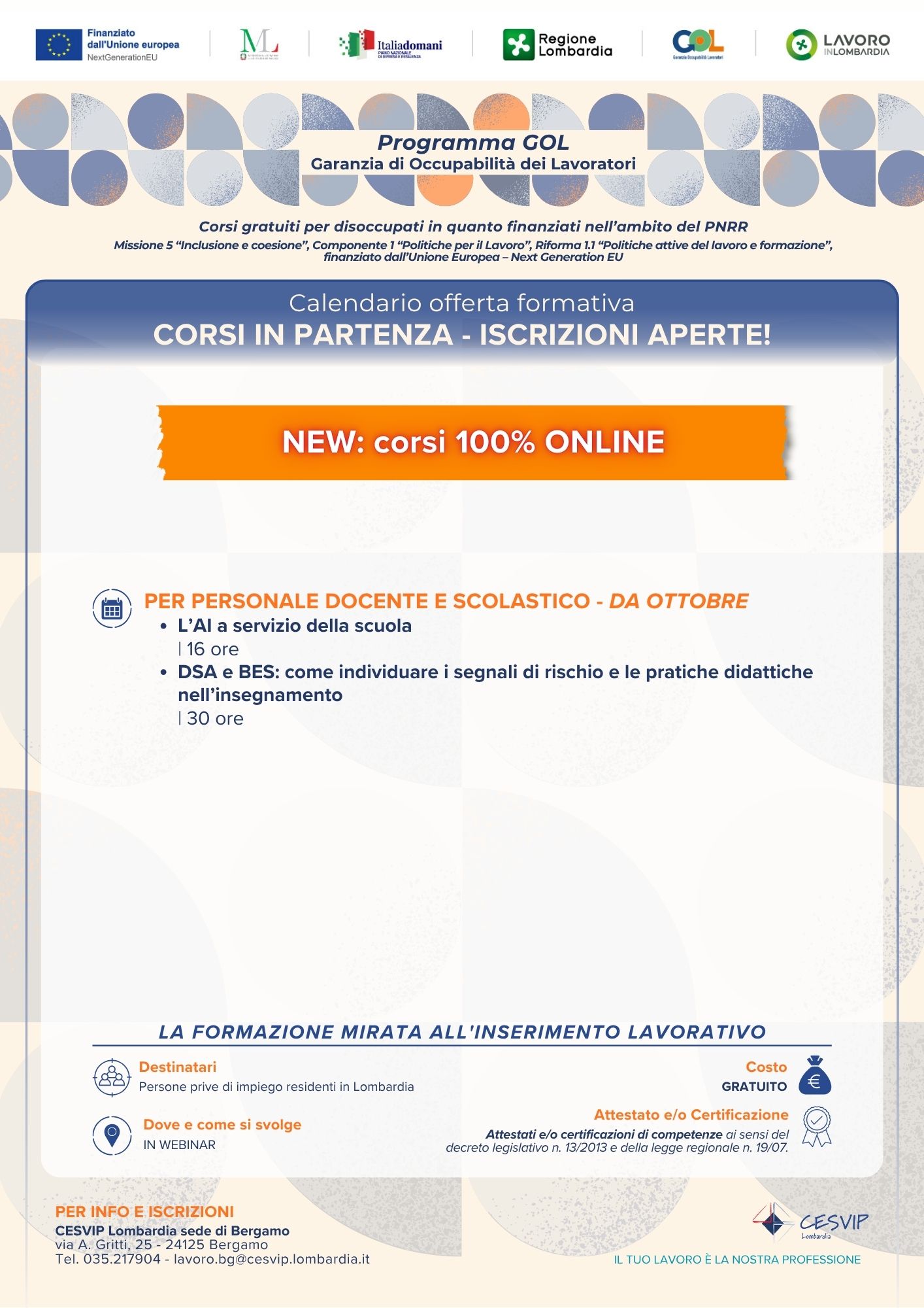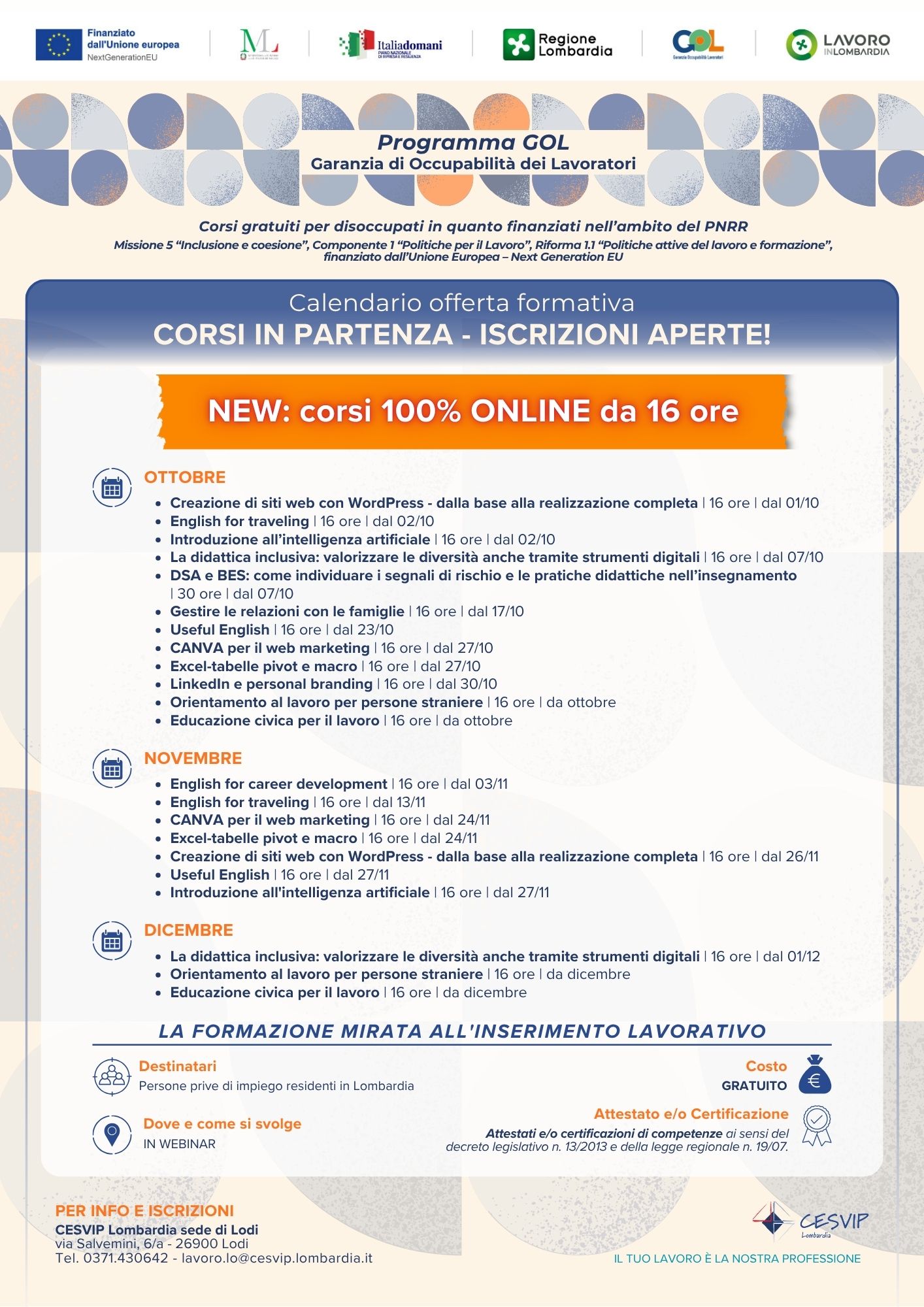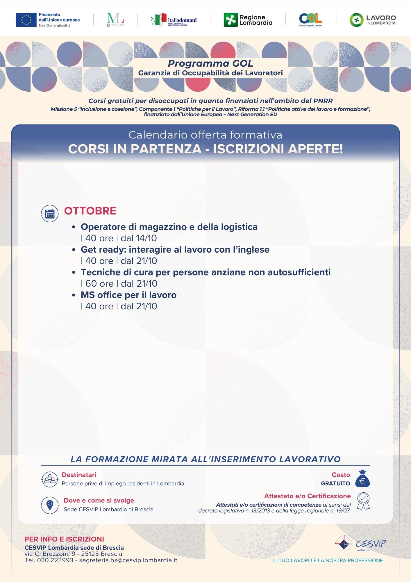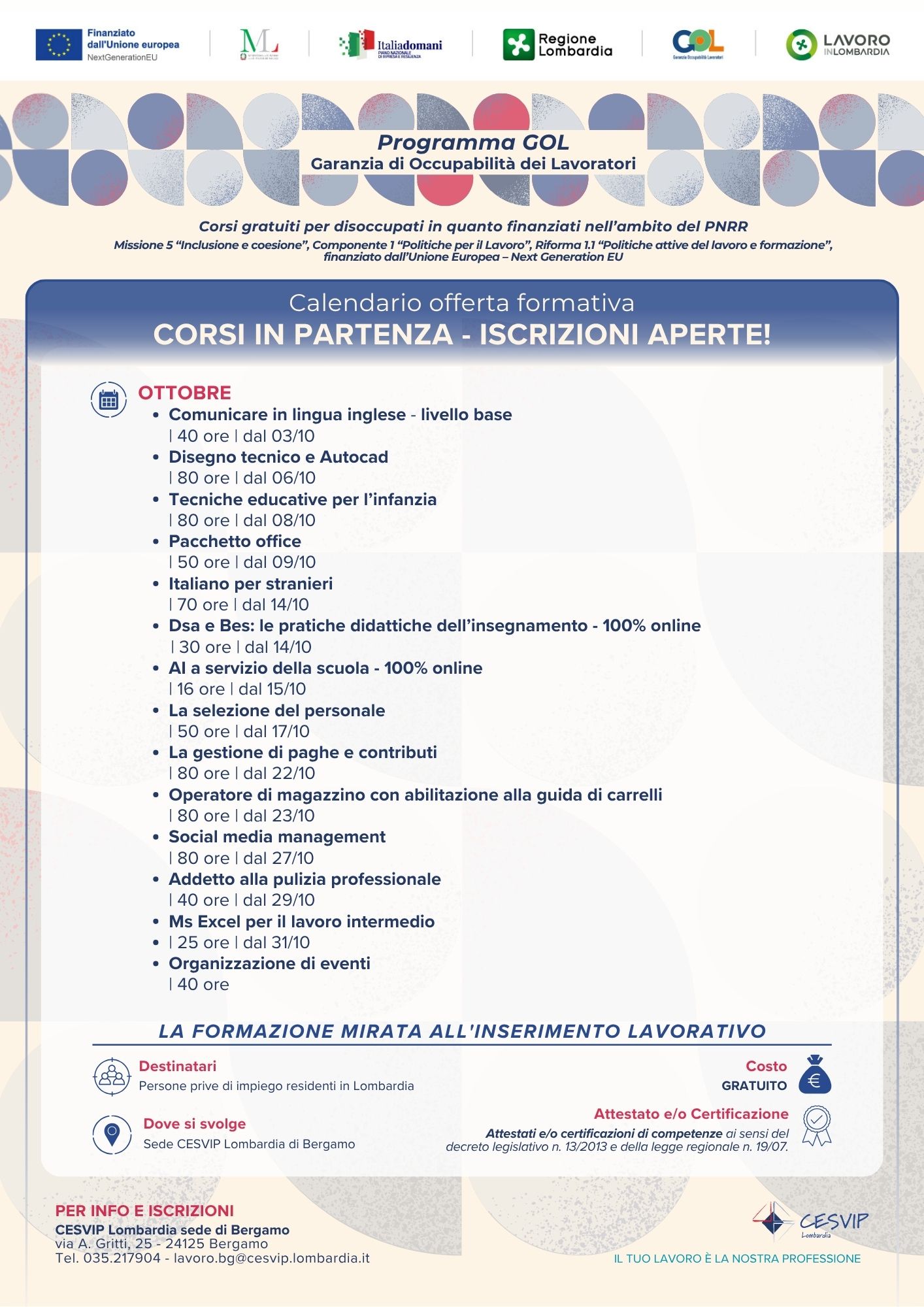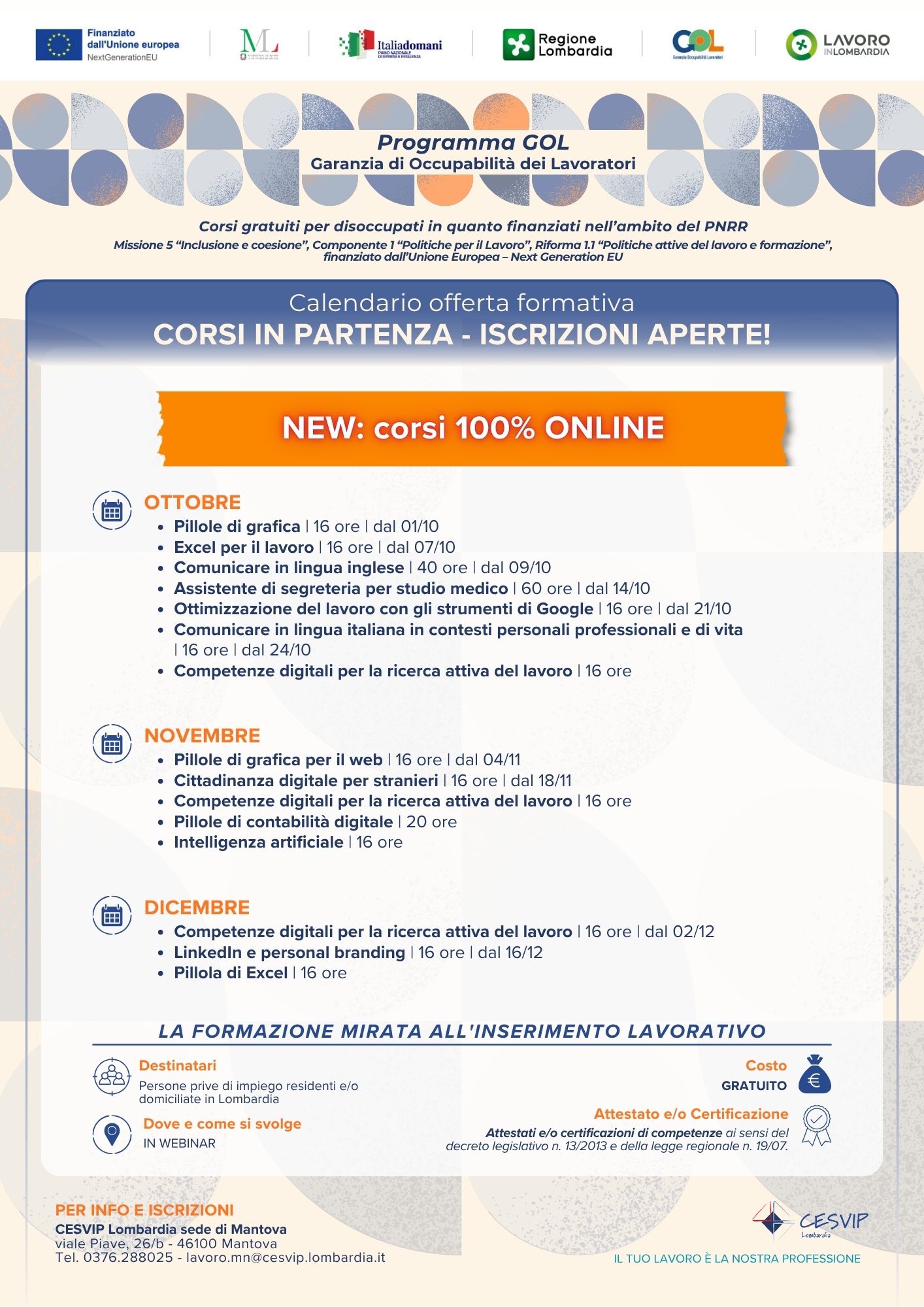 - corsi in presenza e/o modalità mista: ottobre (Cremona) | ottobre (Crema e Soresina)