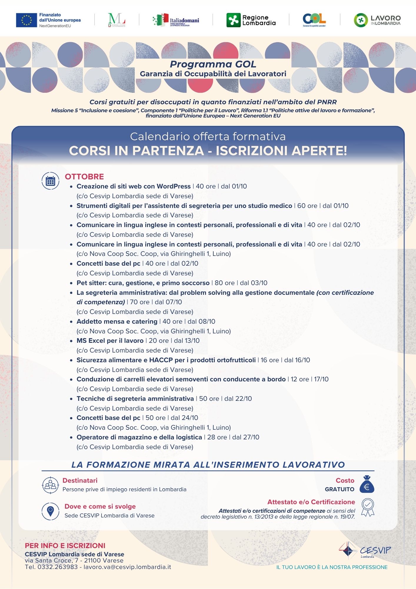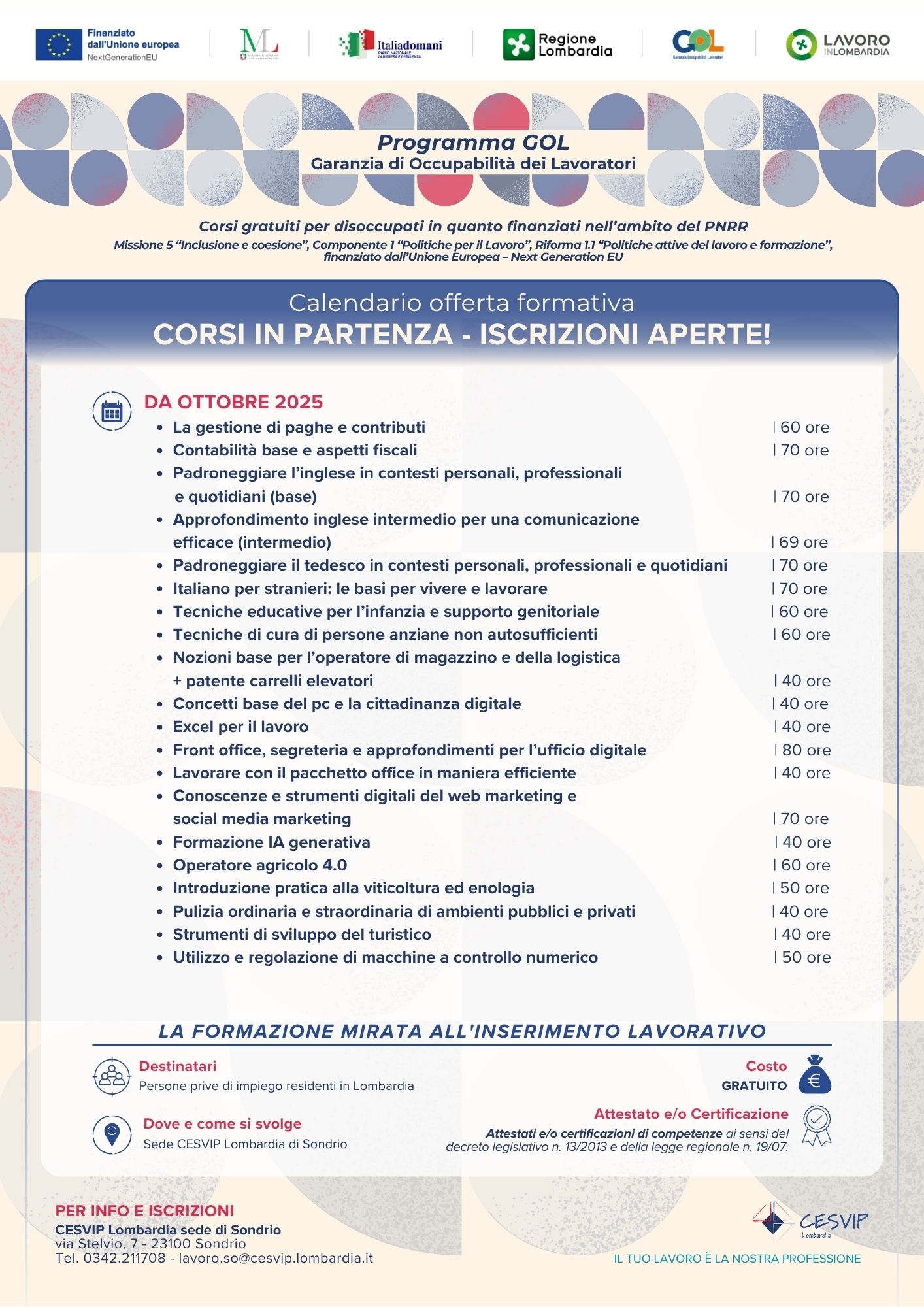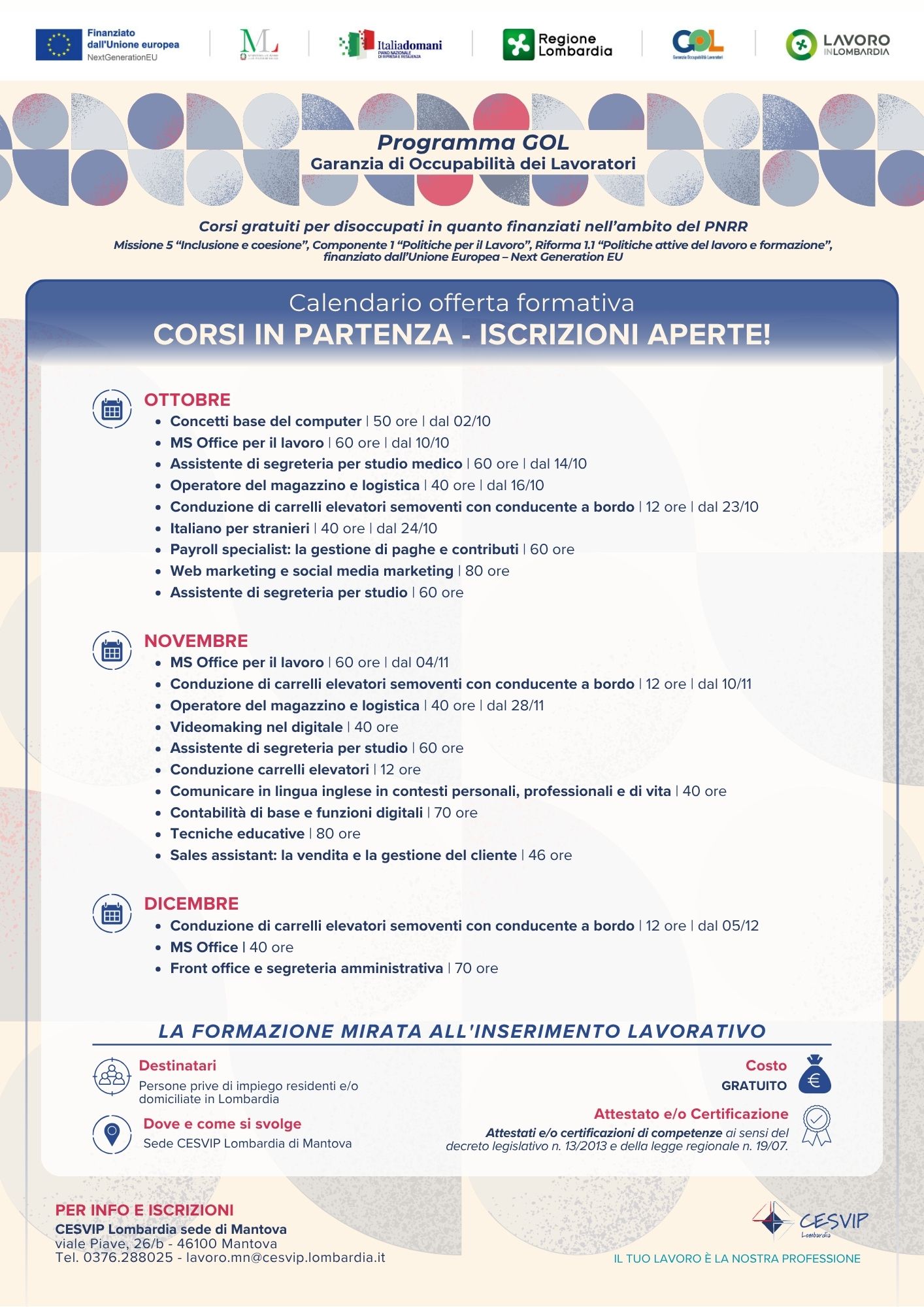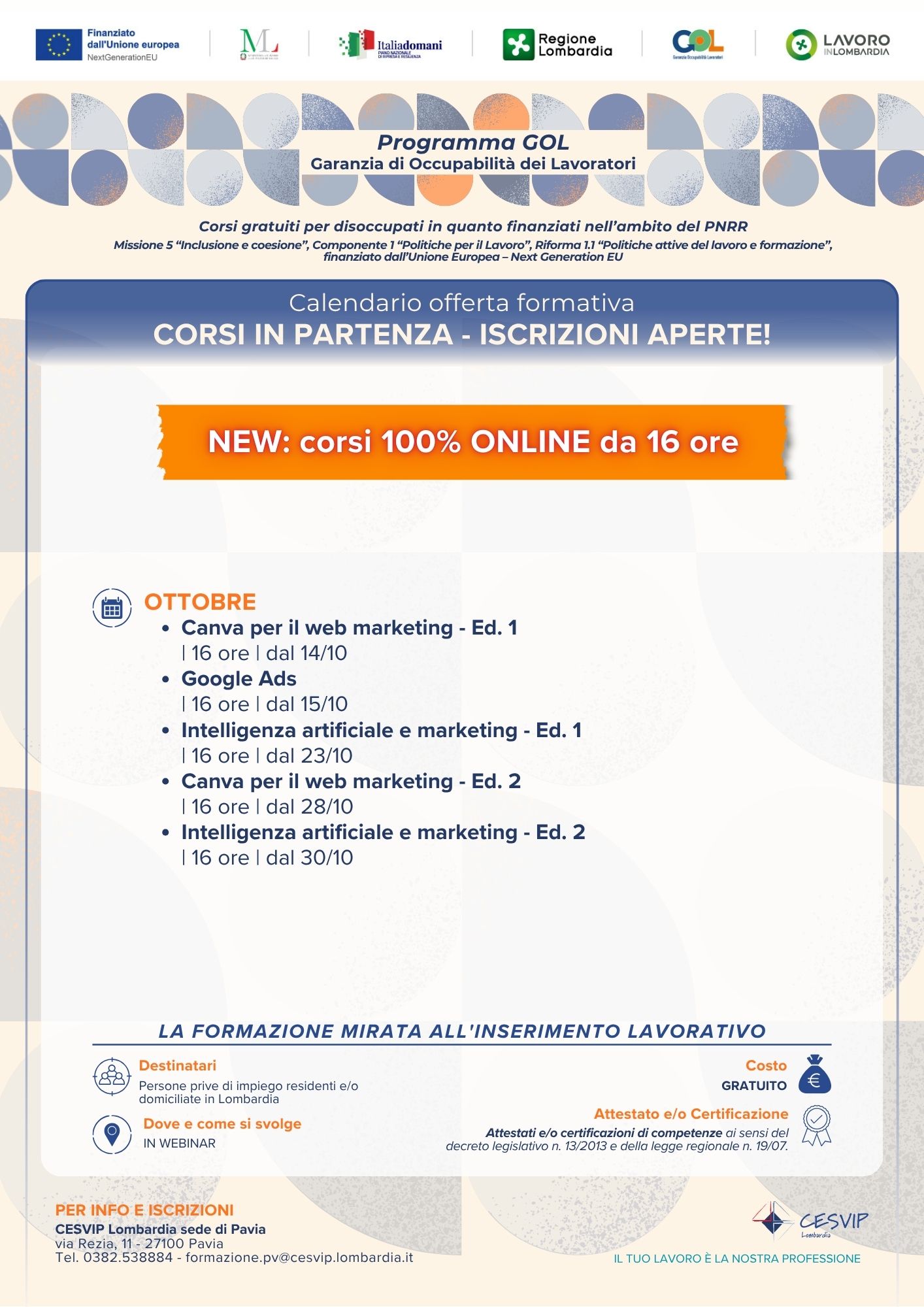 - corsi in presenza e/o modalità mista: ottobre (Cremona) | ottobre (Crema e Soresina)