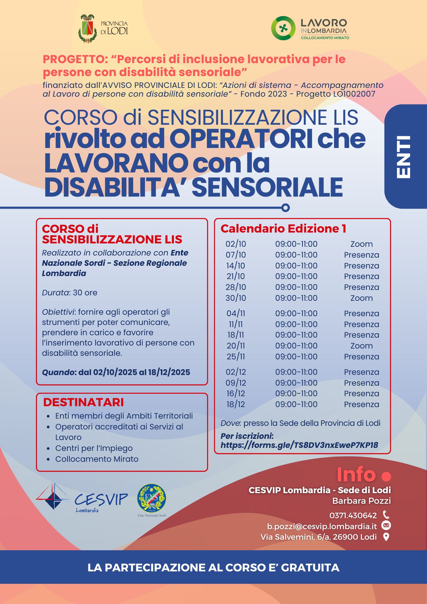 🫶 Cesvip Lombardia, in collaborazione con l’Ente Nazionale Sordi – Consiglio Regionale Lombardia, promuove un percorso formativo gratuito rivolto agli operatori che lavorano con la disabilità sensoriale.