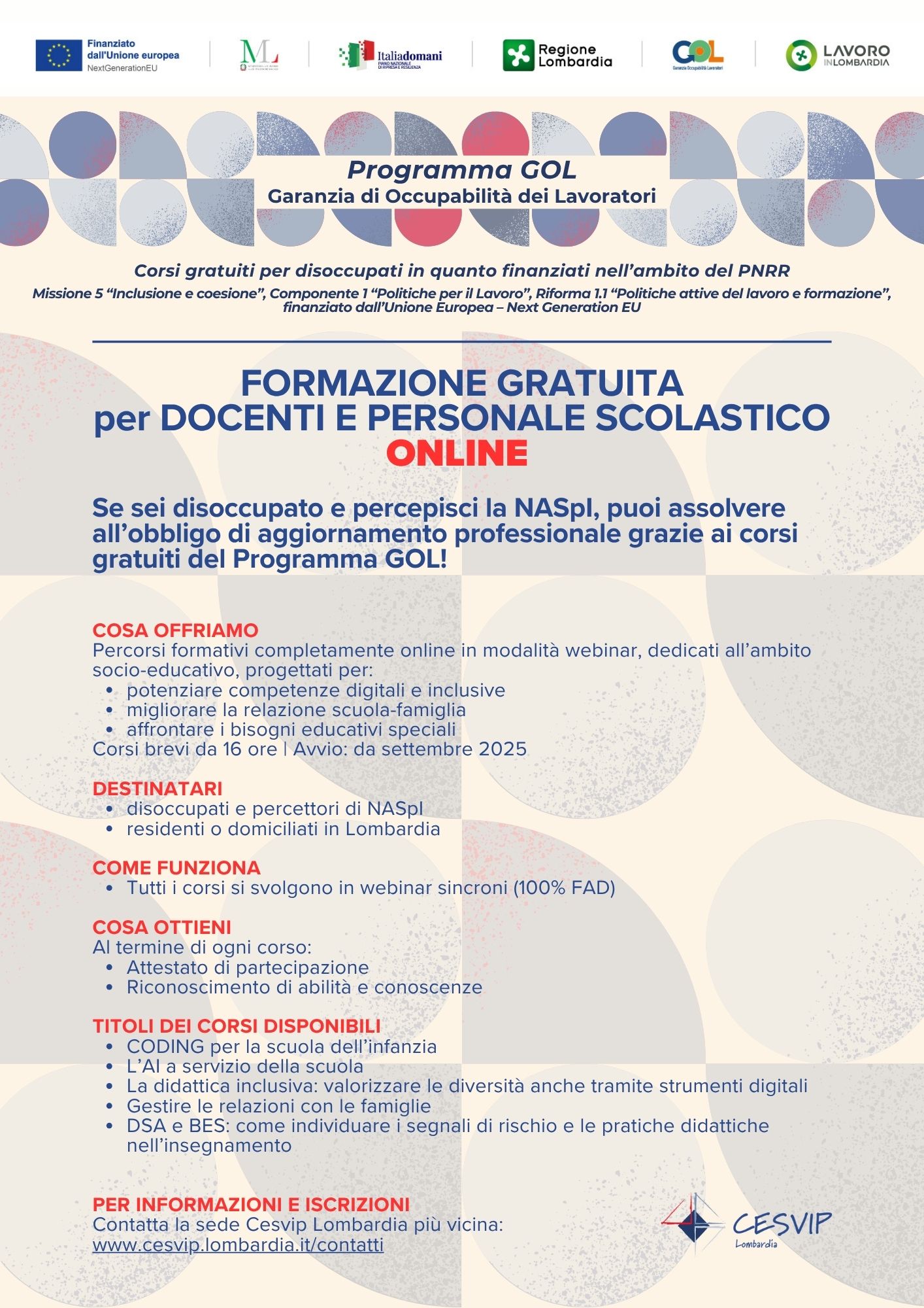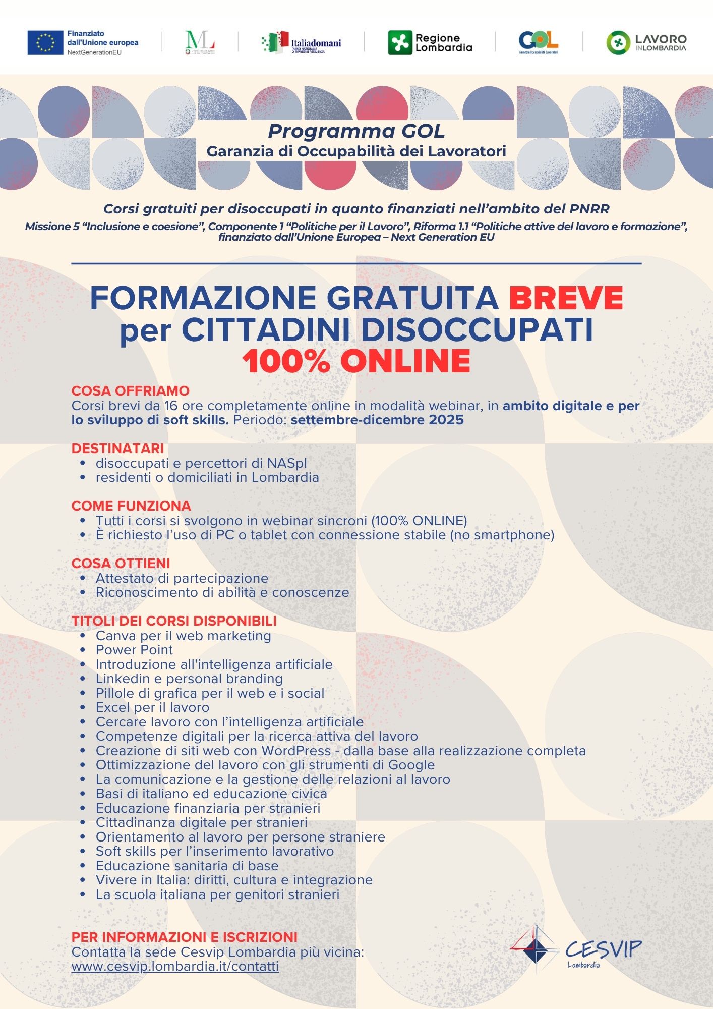 Per informazioni rivolgersi alla sede Cesvip Lombardia della propria città